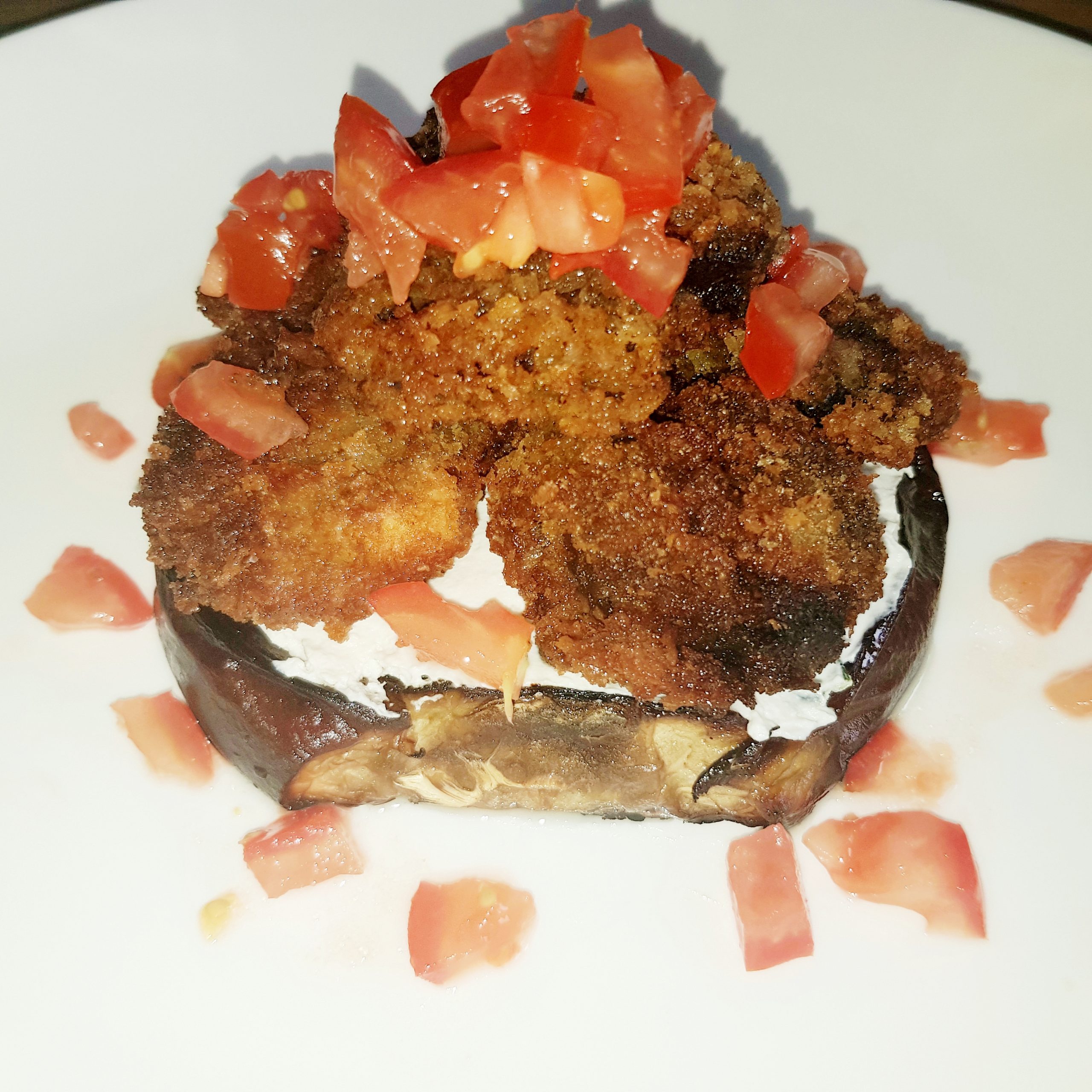 Crispy Chicken Livers with Almond Milk Cheese and Roast Aubergine